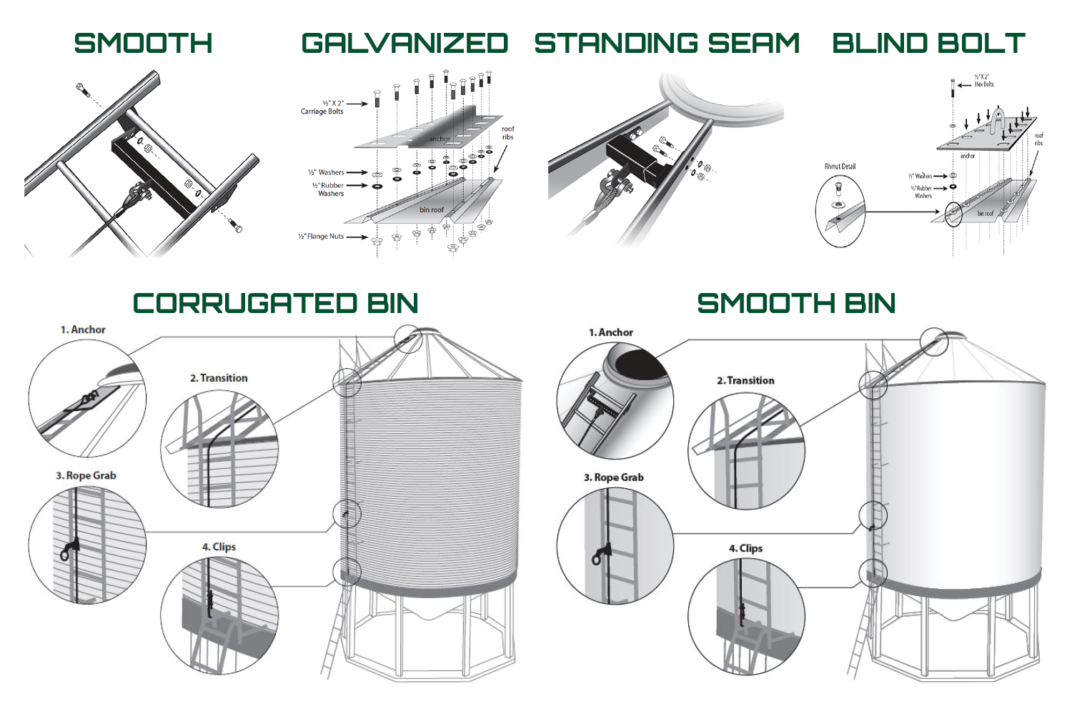 Anchor systems designed to attach securely to standing seam grain bin roofs without compromising structure.